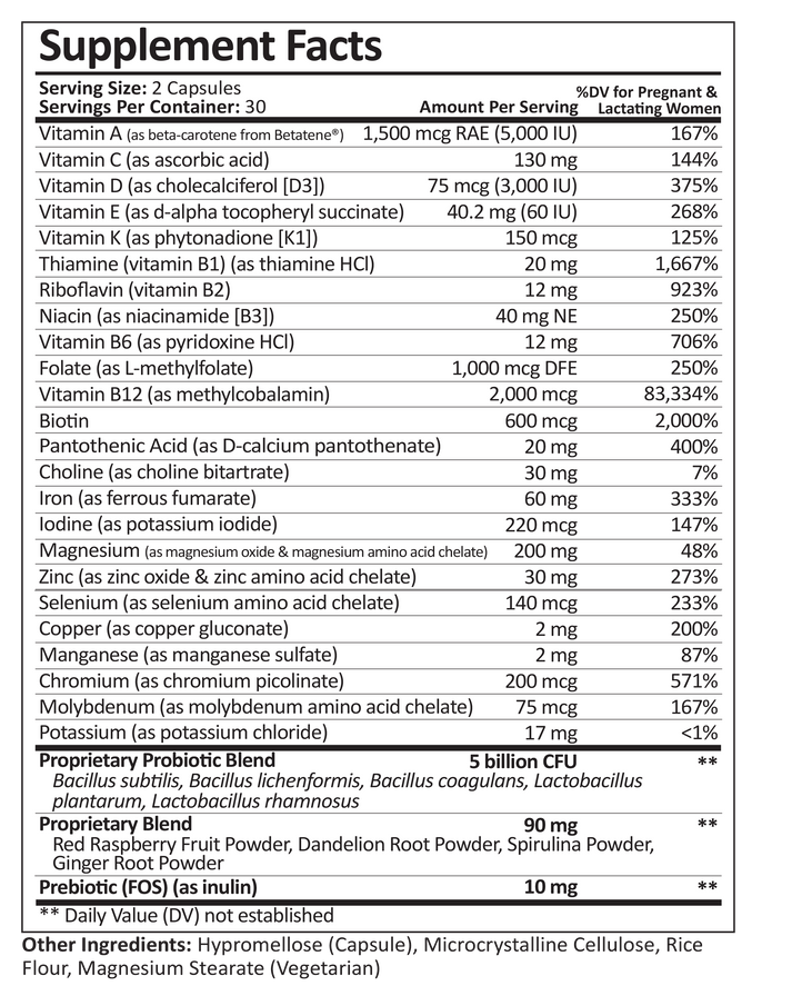 Each two-capsule serving provides a thoughtful blend of essential prenatal nutrients—including folate (L-5 MTHF), iron, vitamin B12, vitamin D3, and choline—alongside gut-focused probiotics, prebiotic fiber, and a botanical blend selected to support digestive balance and prenatal comfort.*