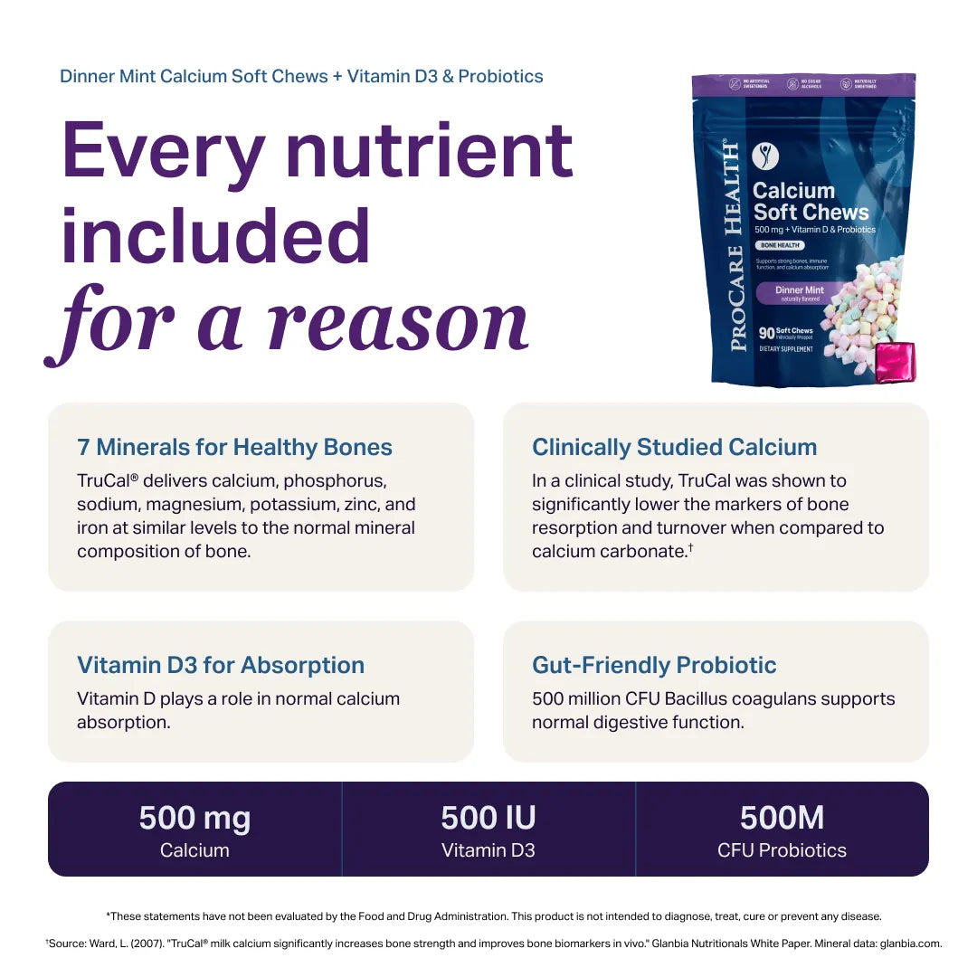 At ProCare Health, we are committed to providing high-quality supplements that you can trust. Here's what makes our Calcium Soft Chews special: