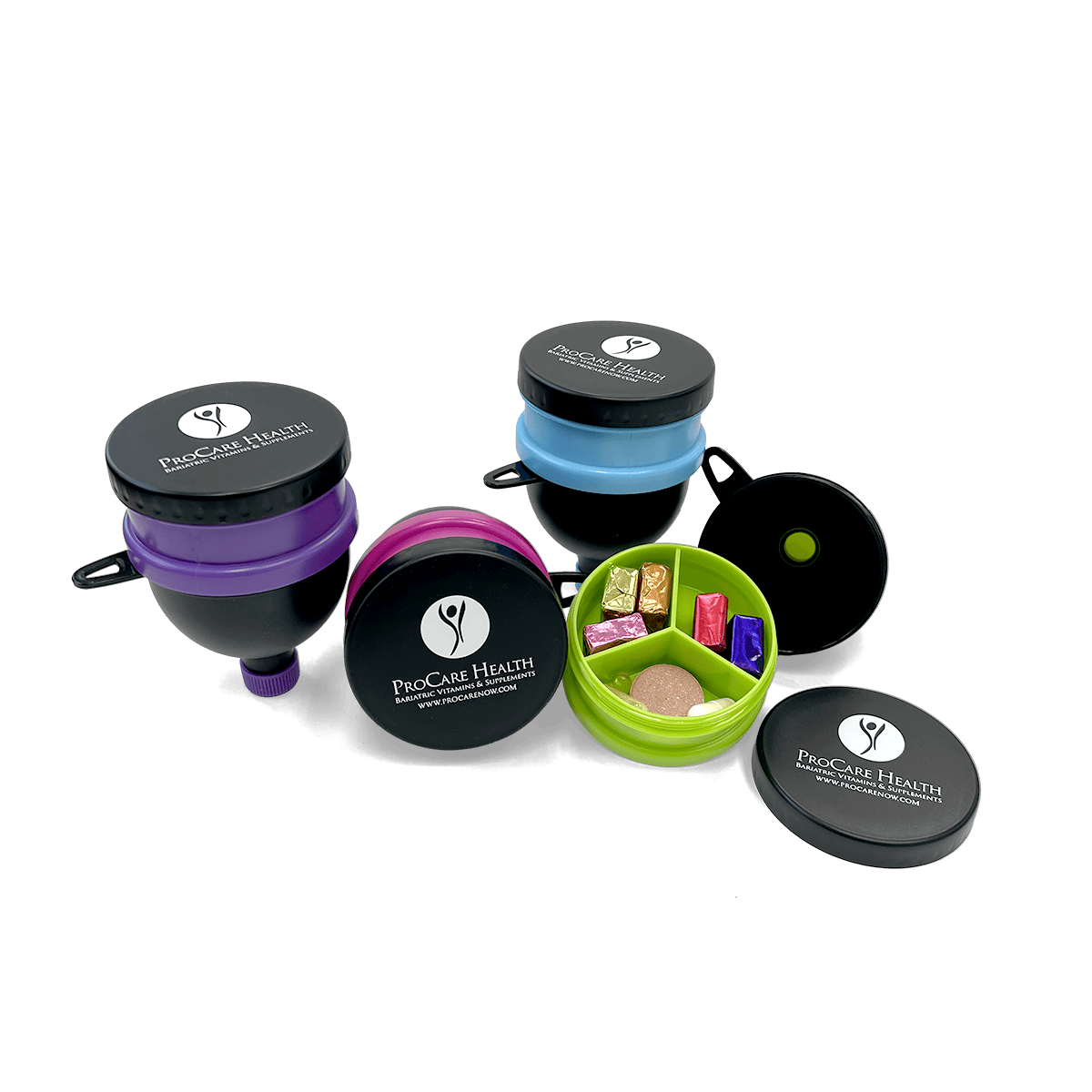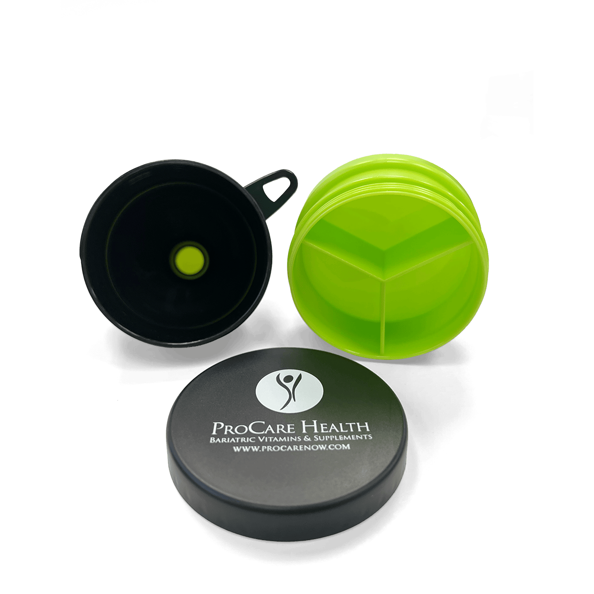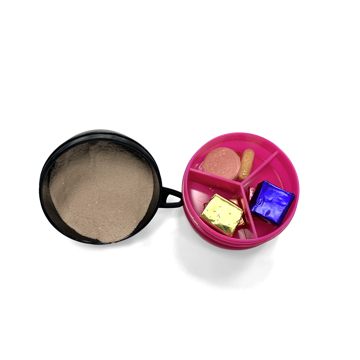 Never be without your daily vitamins or supplements again. Our multi-function funnel makes it easy to take your favorite powdered products and vitamins on the go. Use it as a standalone funnel for drink mixes or attach the split compartment to store additional supplements—all in one compact design. A secure twist-off cap keeps everything contained wherever your day takes you.